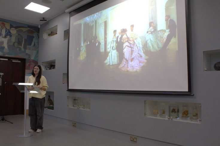 Maria Gilroy‑Toscano (presenter) and Emily Crew (script refiner) worked on a 10-minute presentation exploring James Tissot’s 1873 artwork Too Early. Their hard work paid off, with Maria’s presentation being chosen as the overall regional winner by artists Fleur and Alastair Mackie.