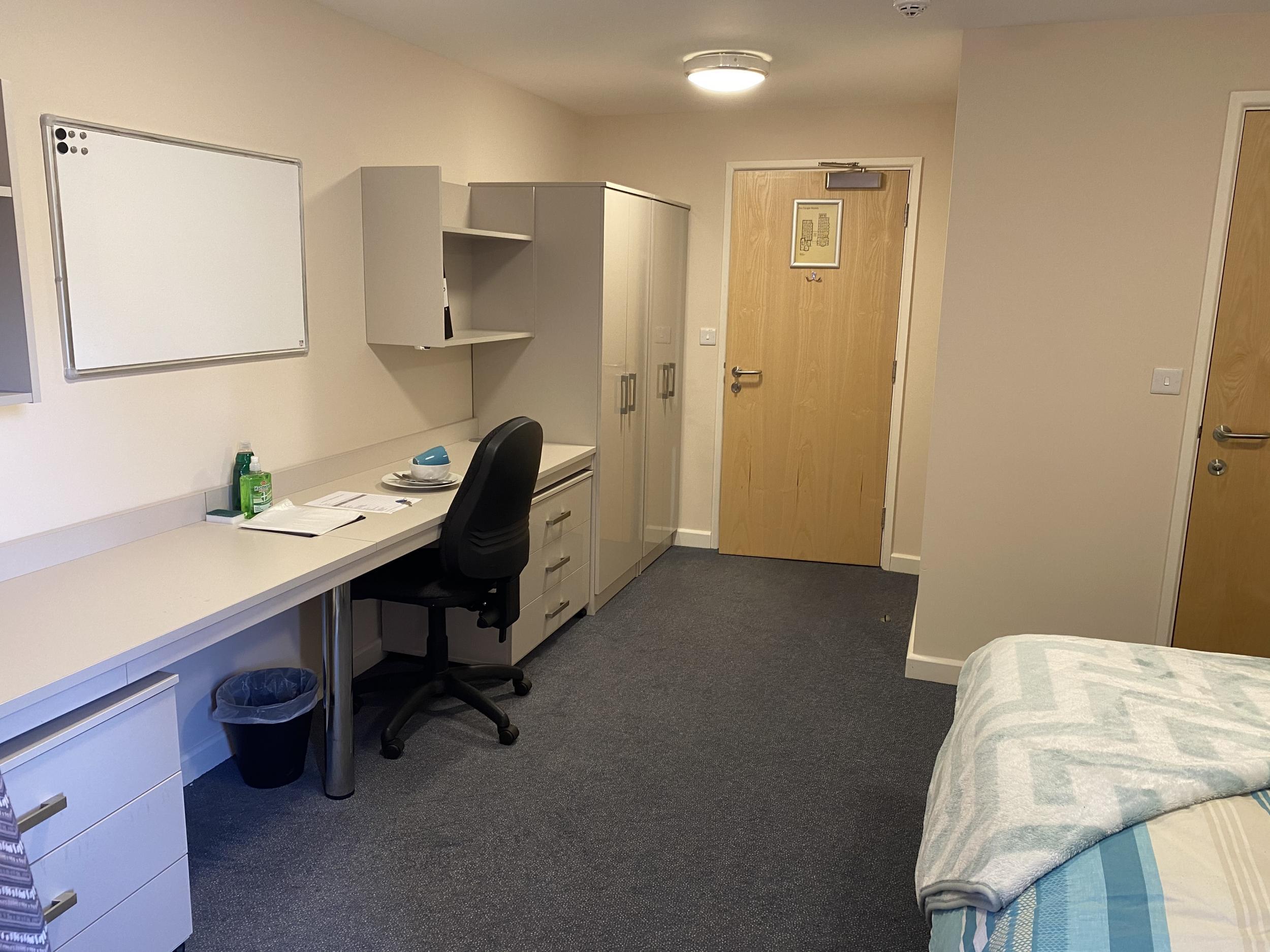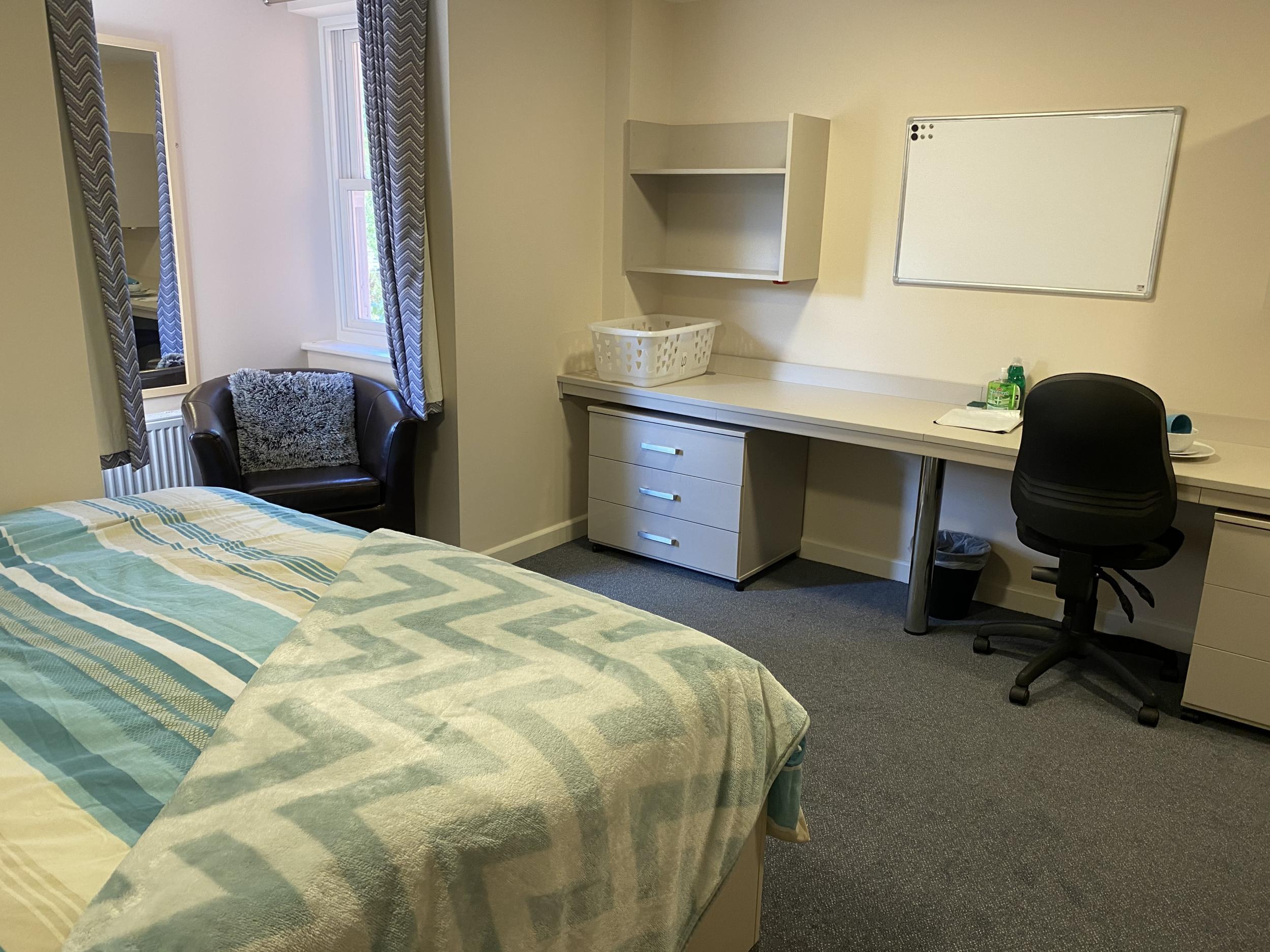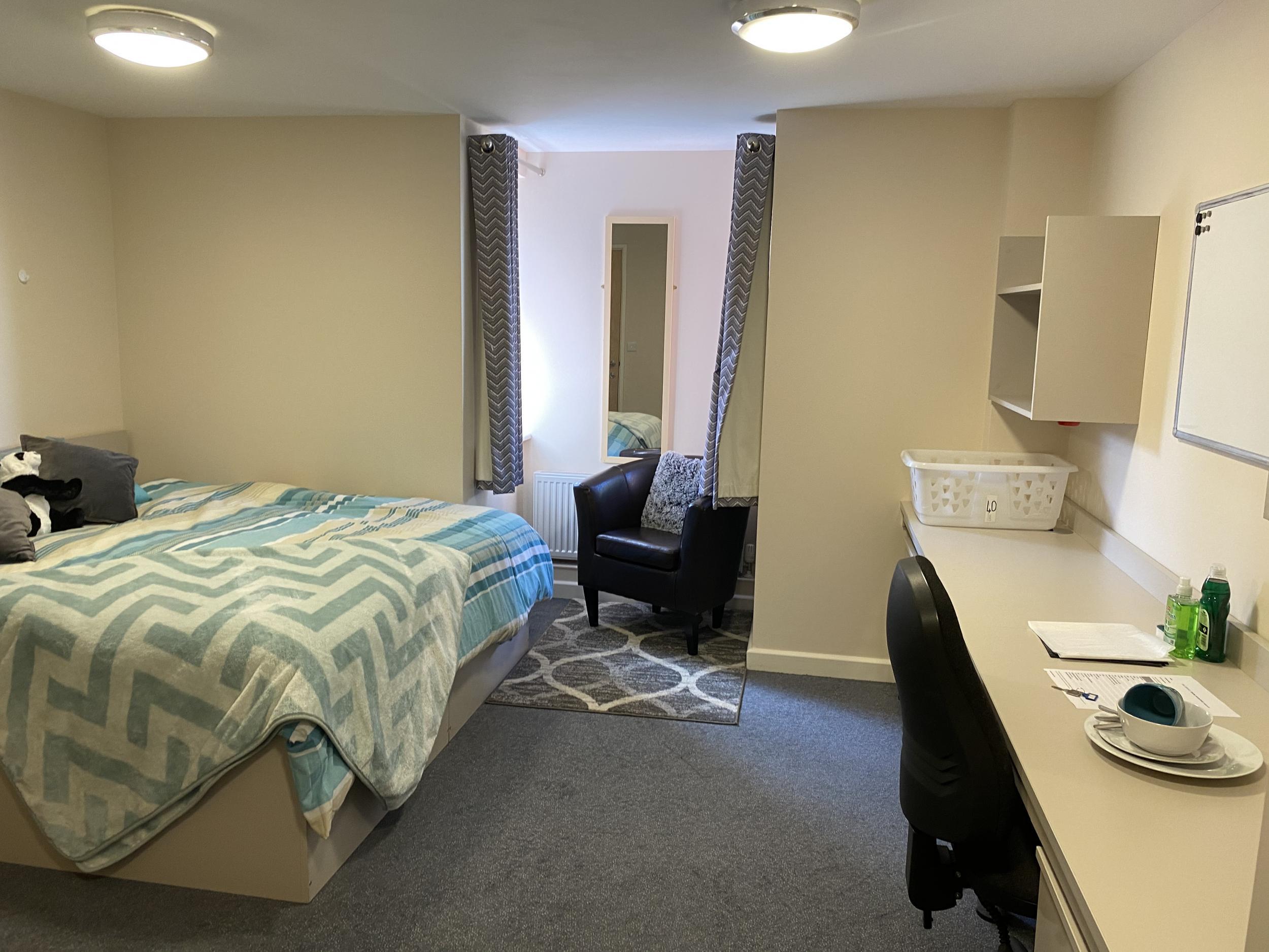 In your bedroom, as standard, you will have a single duvet, pillow, mattress protector, fitted sheet, desk, chair, bookcase, notice board and door hooks for coats. In your en-suite you will have your own toilet, sink and shower. Please bring with you a duvet cover and pillow case and towels.