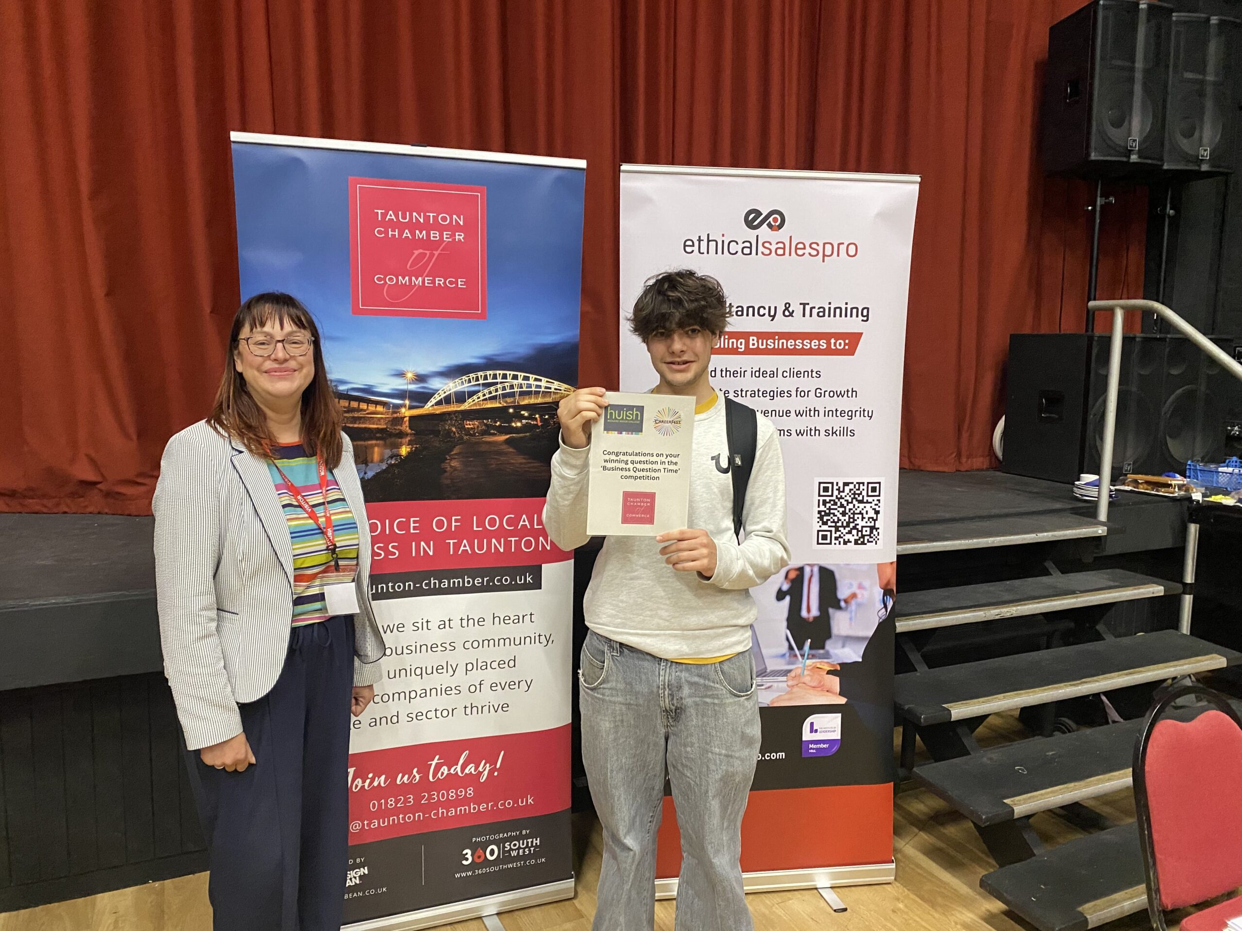 In the Huish Theatre, Bethan Turner, Membership and Events Manager at Taunton Chamber of Commerce, hosted an Employer Panel featuring Laura Mackain-Bremner from Clarke Willmott, Stuart Martin from Ethical Sales Pro, Helen Oliver from Aria Care and Rob Moore, Centre Manager at Orchard Shopping Centre; this panel offered students valuable insights into the world of work. Ahead of the event, students were able to submit questions to the panel, with the best question awarded a £50 Eat the Bird voucher, generously provided by Taunton Chamber; this was won by student Raffi Norris for his future-thinking and considered question: